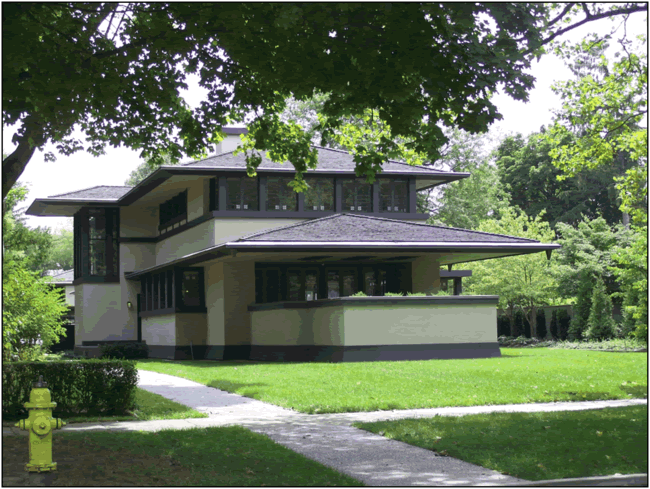Wright helped pick the site and was paid a total sum of about $55,000 to construct the Prairie-style house at 16 East Boulevard, which has four bedrooms and three baths. Built in 1908, the design of the house was achieved in collaboration with Beulah Boynton--unusual for Wright, who didn't always get along well with his clients. Wright also designed the furniture with Beulah's input. With its low, flat roofs, overhanging eaves, long horizontal rows of windows, and sharp lines punctuated by flights of colored glass, the Boynton house looked completely different from any other dwelling in Rochester. Mr. Boynton and his daughter lived in the house until 1918, when they moved to New York City.