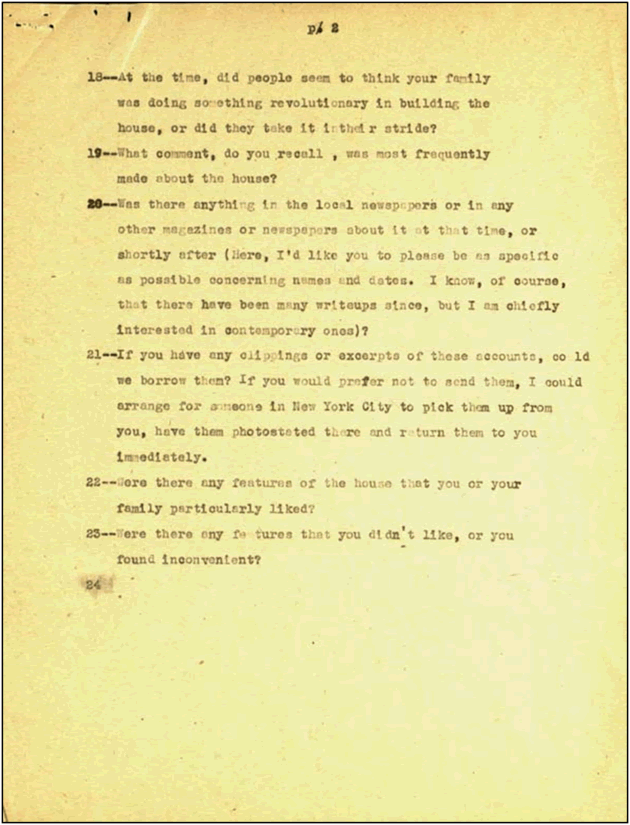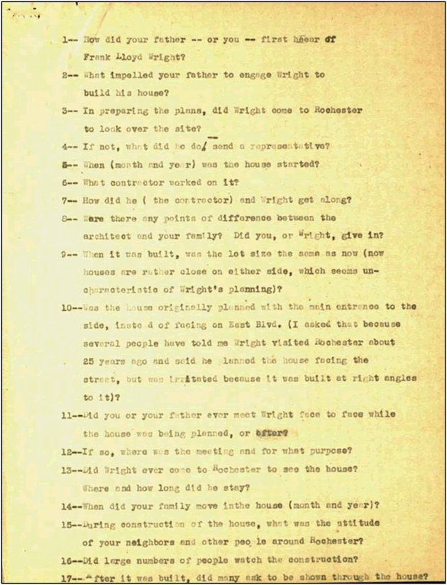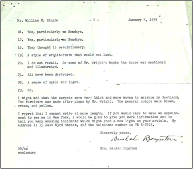 In 1954, Times-Union reporter William M. Ringle wrote to both Wright and Beulah Boynton for more information about the house for an article he was working on.