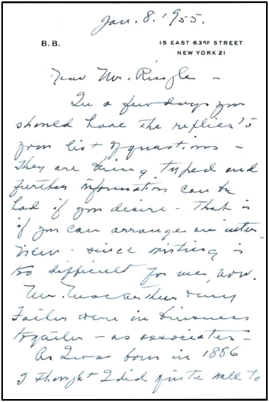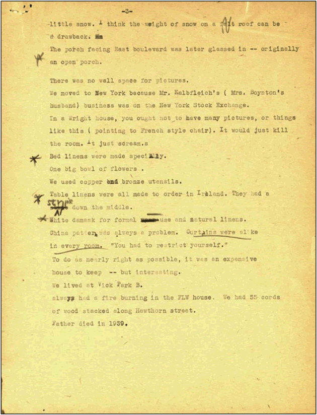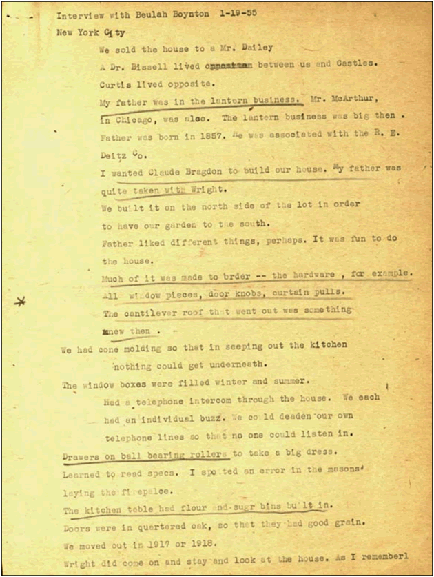 In January 1955, Ringle went to New York City to visit Beulah and to interview her about her recollections of the Boynton House--its design, construction, and what it was like to live in a piece of "living art."